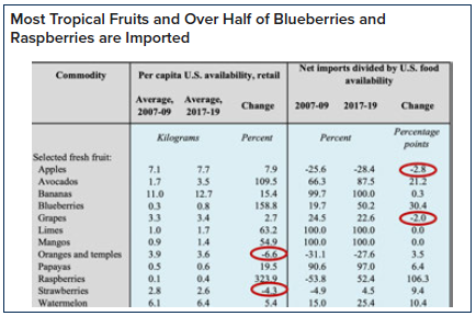 The share of US fresh fruit that is imported rose from 40 percent in 2000 to 60 percent in 2020 due to the especially sharp jumps in the import share of blueberries, from 40 percent to 70 percent, and strawberries, from seven to 21 percent.